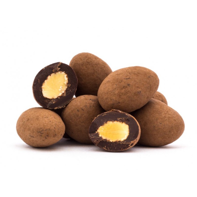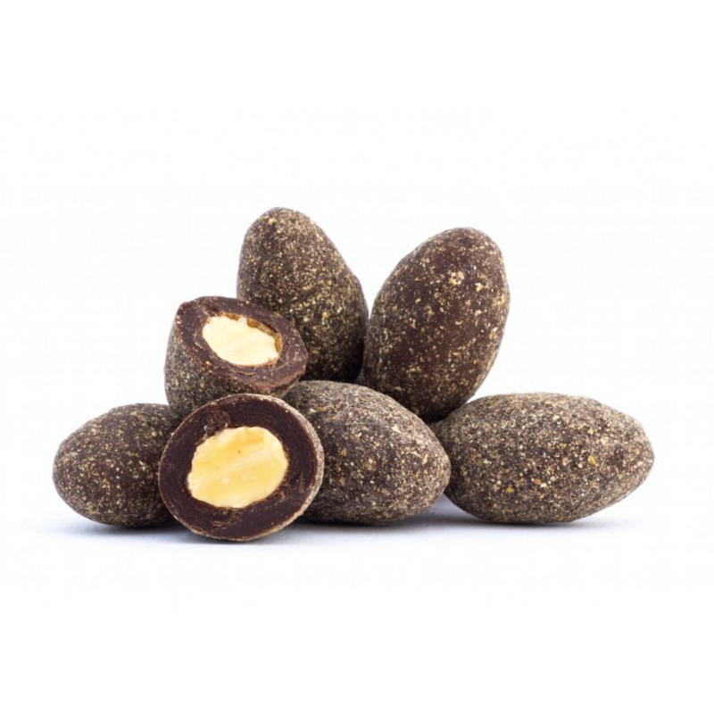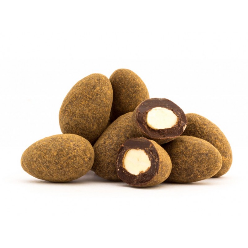 The unique taste of dry roasted California almonds in dark chocolate in cocoa. This combination enhances the taste of dark chocolate.